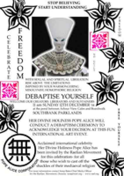 The Southbank Parklands Debaptism Ceremony poster for the Australian Raelian action in December 2004 wil be included in an important upcoming exhibition in Brisbane.